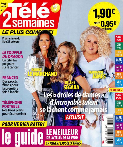 Télé 7 jours interviewe Eric Antoine.Télé poche confesse Laurent Gerra.Télé star raconte le retour de Fabienne Carat dans « Plus belle la vie »/Télé loisirs interroge Julie Gayet.Télé câble sat interroge Julia Roberts et. Gorge Clooney.« Télé 2 semaines et Télé 15 jours parlent de « La France a un incroyable talent ».